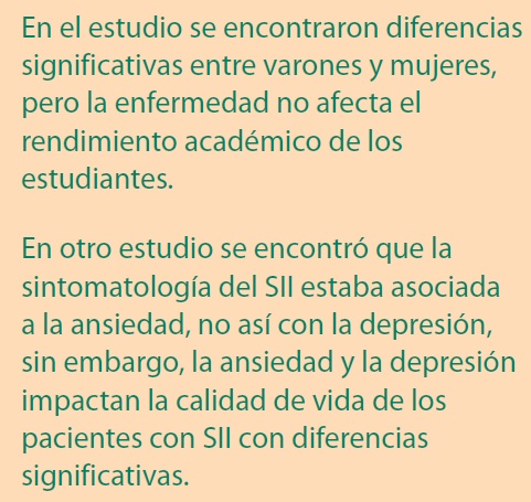 El SII muestra un comportamiento diferente entre varones y mujeres, y es mayor la prevalencia en estas últimas, asimismo, la presencia de ansiedad, depresión y estrés, se asociaron fuertemente al síndrome. Aun cuando se encontraron diferencias en la presencia de SII entre varones y mujeres, así como su asociación con ansiedad, depresión y estrés, en su conjunto no parecen afectar el rendimiento escolar de los estudiantes, ya que los promedios de calificaciones y el promedio de materias no aprobadas se distribuye igual entre los 2 grupos de alumnos con y sin SII. Sin embargo aunque este rendimiento no se vea afectado, en futuras investigaciones habrá que cuantificar el impacto en la calidad de vida de los estudiantes.