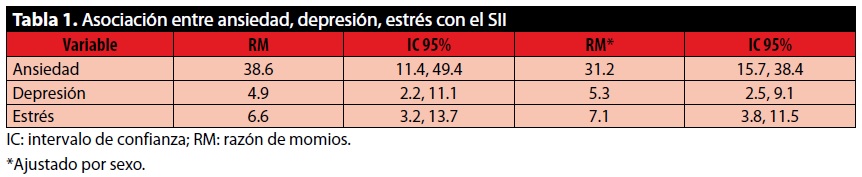 La ansiedad, el estrés y la depresión, mostraron una asociación significativa con el SII. La asociación mayor fue con la ansiedad, seguida por el estrés y la depresión, en la tabla 1 se observan los resultados de los cálculos de la RM cruda así como los intervalos de confianza al 95%.