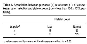 742 individuals in a 5-year period were refered to Laboratorios Clínicos de Puebla to asses the digestive tract infection by H. pylori; in a subset of 237 of these patients the platelet count was also measured. In this group of 237 patients, H. pylori infection was identified in 99 patients (42%); the prevalence of thrombocytopenia in these 99 patients was 14% (14/99). On the other hand, nine patients with a low platelet count were identified in the 138 individuals without H. pylori infection (6.5%). The association between thrombocytopenia and H. pylori infection was not significant using the chi square test, see table 1.