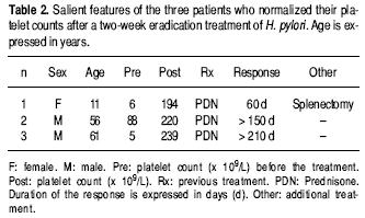 On the other hand, in 23 consecutive patients with chronic refractory thrombocytopenic purpura prospectively studied and treated at the CHMI H. pylori infection was done as part of the initial laboratory workup; in all these individuals overt autoimmune diseases had been ruled out. In this group the prevalence of H. pylori infection was 60% (14/ 23); this figure being similar to that informed in the general population of Mexico, which is around 66%.16 In the 14 patients who were found to have both thrombocytopenia and H. pylori infection, quadruple-drug (amoxicillin, clarithromycin, bismuth subsalicylate and pantoprazole) treatment was given during a two-week period, the platelet count recovering in three of them; the table 2 shows some features of the three individuals who normalized their platelet counts; H. pylori was cleared in all the patients, Patients numbers 2 and 3 have had sustained responses for over 150 and 210 days respectively, whereas patient number 1 had a transient response for 60 days with a subsequent relapse of the thrombocytopenia which lead into splenectomy. In this group of patients, median age was 53 years (range 7 to 78), there were 8 males and 6 females, whereas the platelet count has a median of 74 x 109/L (range 5 to 98).