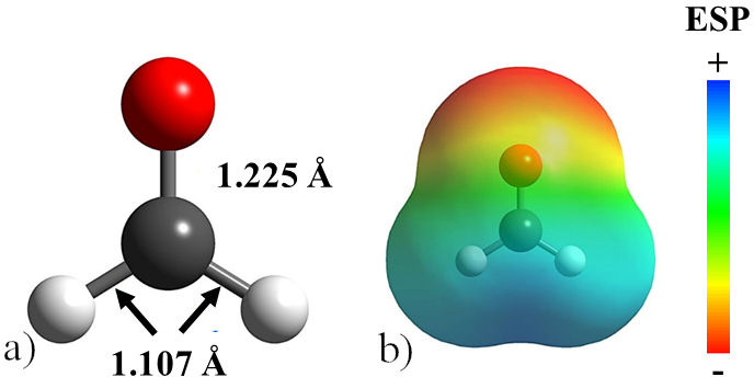 FIGURE 1 a) Optimized structure of the formaldehyde molecule. b) Electrostatic potential map with an isosurface of 0.004 a.u. for the formaldehyde molecule. Relevant bond lengths are indicated.
