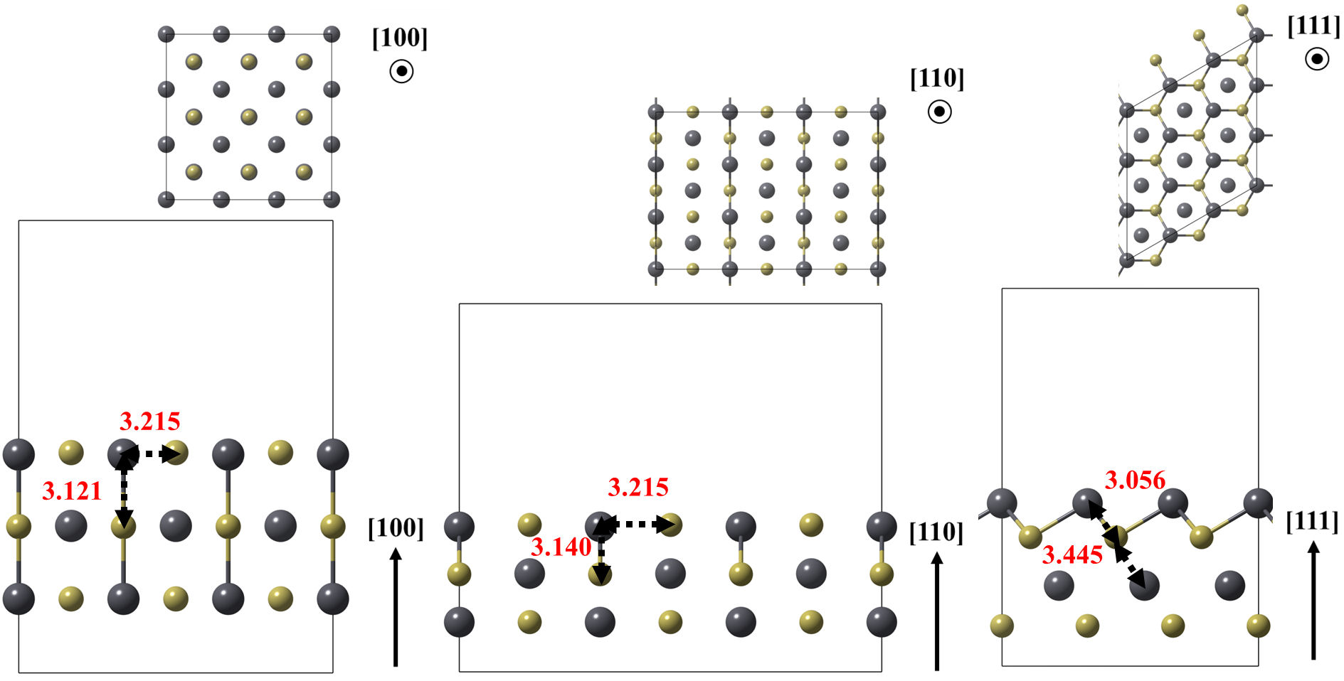 FIGURE 3 Optimized models of the (100), (110) and (111) Pb surfaces of the PbTe. Relevant bonds are annotated in angstrom units. Crystallographic directions are indicated as well.