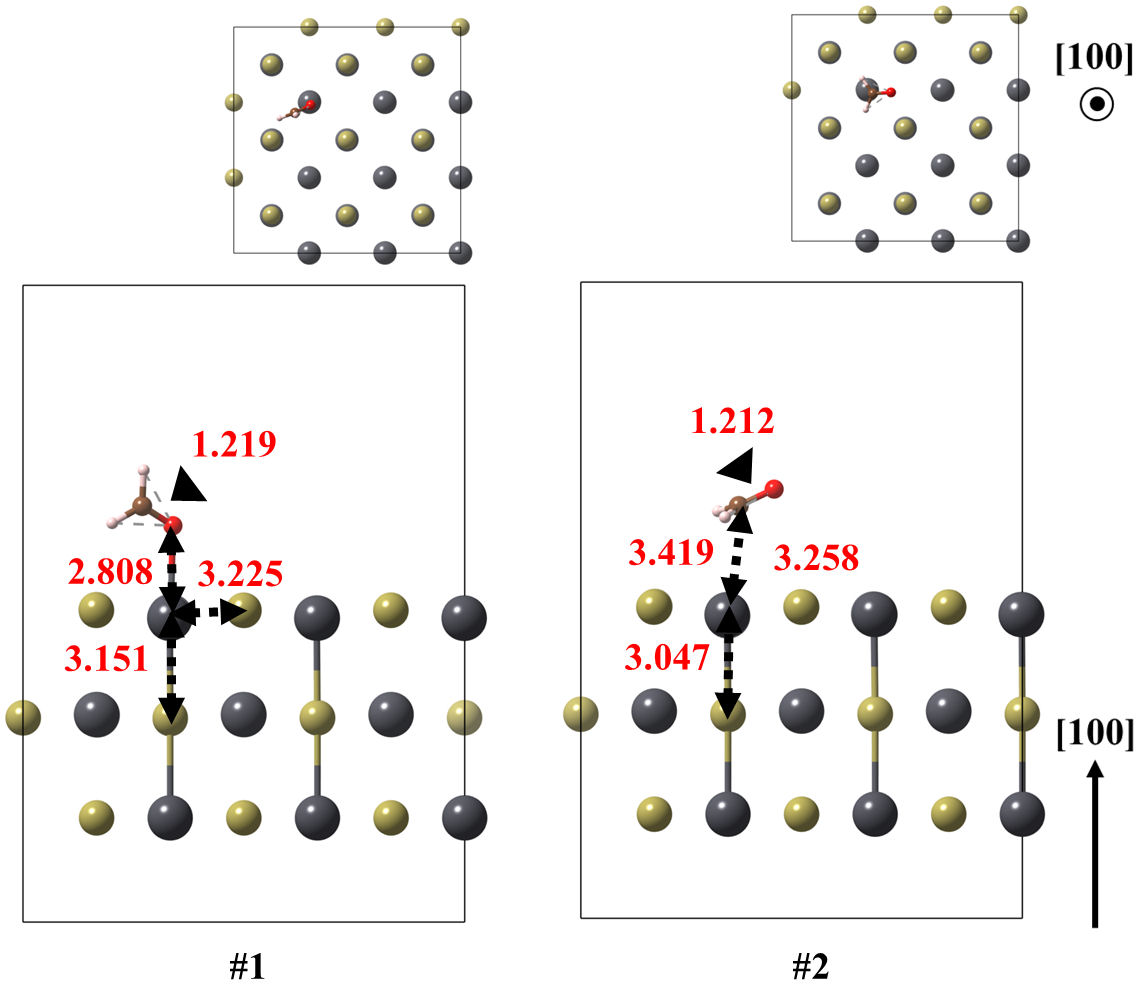 Firstly, the (100) surface with formaldehyde was obtained in two configurations. Whereas the ground state exhibits the CH2O coordinated with the surface by its oxygen atom, with 3.225 Å of bond length and adsorption energy of−0.361 eV, state number 2 is oriented to its carbon atom. That state is 0.172 eV above the ground state and with a lower moleculesurface adsorption energy of about −0.178 eV.