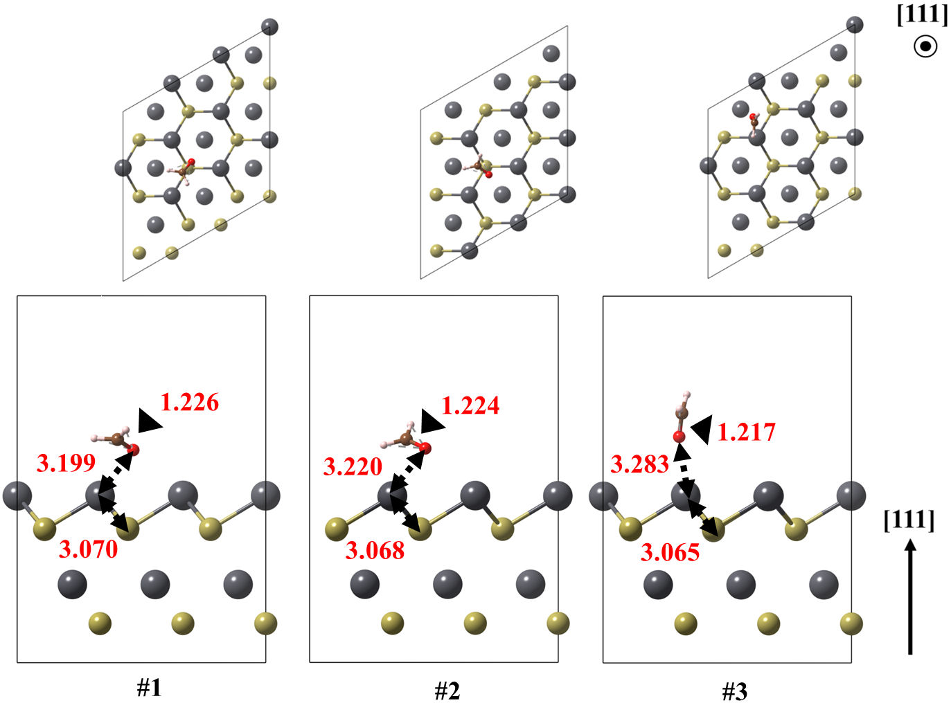In case of (110) surface, the ground state and the following low-lying structure are obtained with 0.288 eV of energy difference. Once again, the ground state structure is obtained with the (CH2O) attached to the surface by oxygen, whereas the other is state by carbon. In these case, the shortest molecule-surface bond lengths are reduced down to 2.671 and 2.867 Å respectively. In this case, the adsorption energy is −0.917 eV.