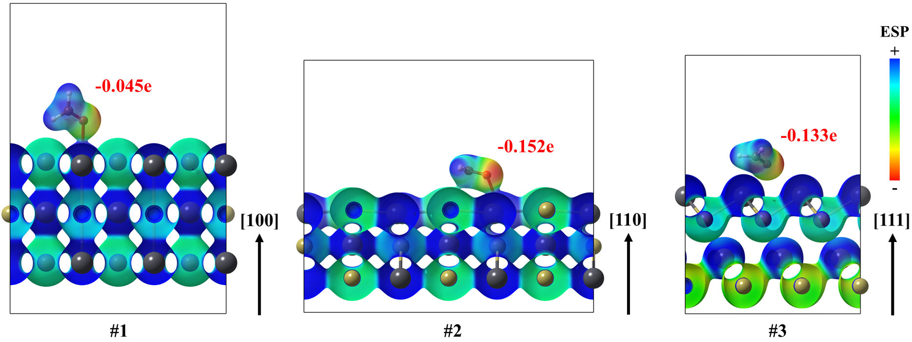 FIGURE 8 Electrostatic potential mapped on isosurfaces, with 0.02 a.u. of electron density, for (100), (110) and (111) Pb surfaces of the PbTe interacting with formaldehyde in their ground states. Also, Bader charges on formaldehyde are annotated as well.