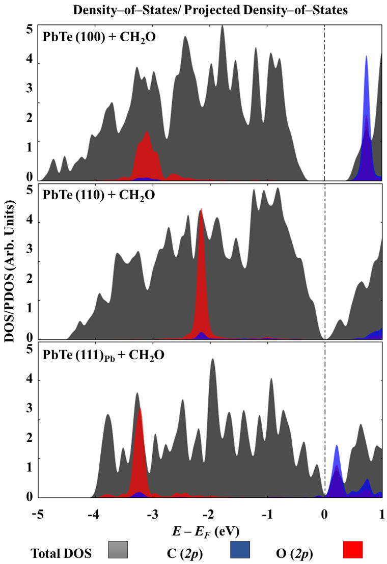 In all cases, the electrostatic potential maps showed that the interacting formaldehyde molecule, in its ground state, is directed to the lead atom by its region with low ESP. The above is consistent with the highest electronegativity of oxygen in comparison to all the constituents for formaldehyde (Fig. 8). Interactions between the CH2O and the surface are mostly polar-electrostatic, as charge donations took place. In addition, the calculation of the total Bader charge on the surface modifier molecule exhibited that formaldehyde received a charge from the lead telluride surface, ranging from −0.045 to −0.152 e. Although this charge transference is scarce, the above can be related to the notable coordination of formaldehyde on the surface, attributed to a mixed chemysorption-physisorption of the molecule. To state the relationship between the orbitals of the interacting moieties, the total density-of-states for all the interacting systems as well as the projected density-of-states are analyzed below.