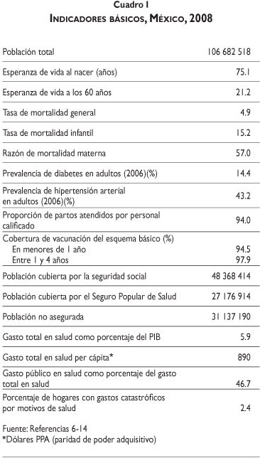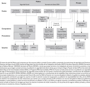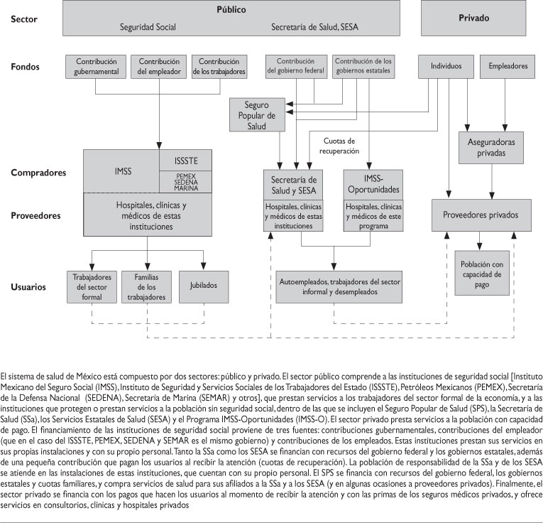 El sistema mexicano de salud comprende dos sectores, el público y el privado. Dentro del sector público se encuentran las instituciones de seguridad social [Instituto Mexicano del Seguro Social (IMSS), Instituto de Seguridad y Servicios Sociales de los Trabajadores del Estado (ISSSTE), Petróleos Mexicanos (PEMEX), Secretaría de la Defensa (SEDENA), Secretaría de Marina (SEMAR) y otros] y las instituciones y programas que atienden a la población sin seguridad social [Secretaría de Salud (SSa), Servicios Estatales de Salud (SESA), Programa IMSS-Oportunidades (IMSS-O), Seguro Popular de Salud (SPS)]. El sector privado comprende a las compañías aseguradoras y los prestadores de servicios que trabajan en consultorios, clínicas y hospitales privados, incluyendo a los prestadores de servicios de medicina alternativa.