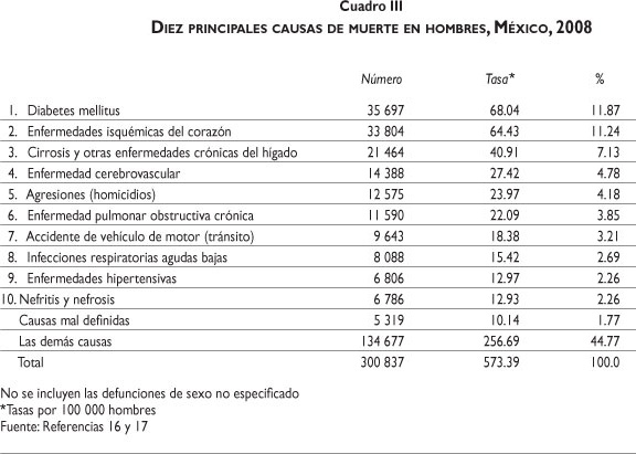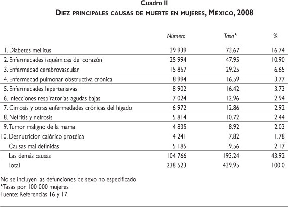 En 1940 la principal causa de muerte en México eran las infecciones gastrointestinales.15 Hoy ya no constituyen una causa importante de defunción en la población general. En contraste, la diabetes mellitus no apareció dentro del cuadro de principales causas de muerte hasta 1990, pero hoy es la principal causa de defunción en hombres y mujeres en todo el país (cuadros II y III), y su prevalencia en adultos es de 14.4%, una de las más altas del mundo.9