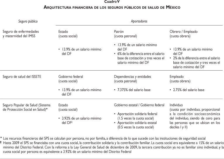 Los servicios de salud que prestan las instituciones de seguridad social a sus afiliados se financian con contribuciones del empleador (que en el caso del ISSSTE, PEMEX y Fuerzas Armadas es el gobierno), contribuciones del obrero o empleado y contribuciones del gobierno. La SSa y los SESA se financian con recursos del gobierno federal en su mayoría, gobiernos estatales y pagos que los usuarios hacen al momento de recibir la atención. El IMSS-O se financia con recursos del gobierno federal, aunque lo opera el IMSS. El SPS se financia con contribuciones del gobierno federal, los gobiernos estatales y los individuos. Los hogares de menores recursos están exentos de estos pagos. Con estos recursos, el SPS le compra servicios para sus afiliados a los SESA.