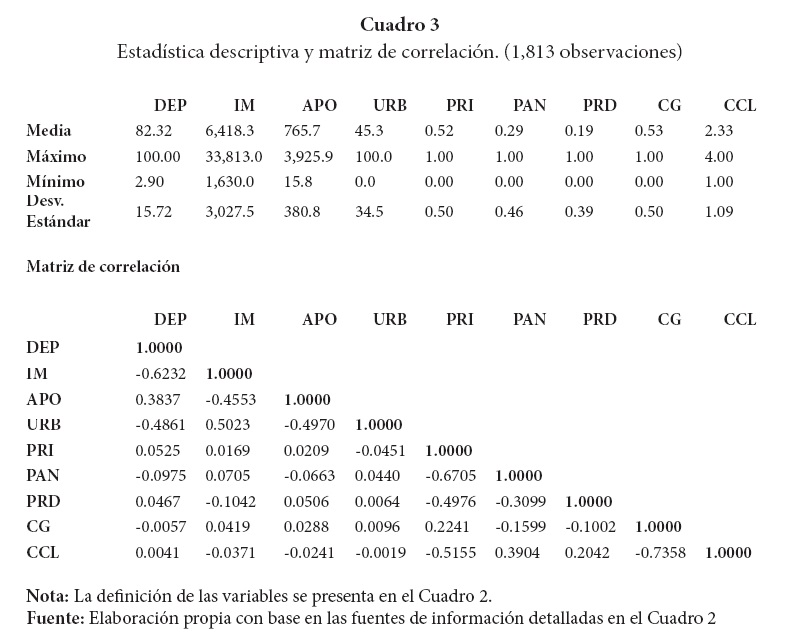Empleamos datos en sección cruzada de los municipios mexicanos para el año 2005. Hemos elegido ese año para este estudio ya que disponemos de una estimación del ingreso municipal, importante variable de control en los modelos que se proponen abajo; en ese año se realizó el conteo de población y vivienda. Además, tal como se presentó en la sección anterior, ese año tiene características políticas interesantes en la perspectiva de este estudio. El Cuadro 2 presenta la descripción de las variables, las fuentes de información y la relación esperada de cada variable independiente con la dependencia financiera municipal, en tanto que el Cuadro 3 contiene estadística descriptiva de las variables empleadas en el artículo.