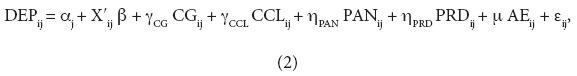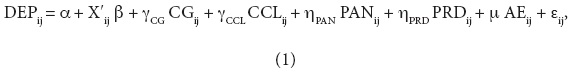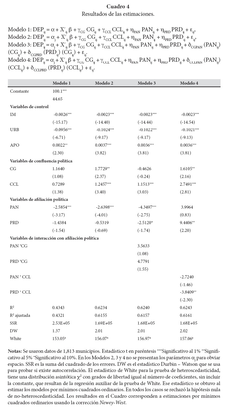 Para el municipio i en el estado j. En la expresión (1), X'ij = (IMij, APOij, URBij) es el vector de variables de control, εij representa el término del error y el vector βʹ = (βIM, βAPO, βURB) contiene los parámetros de las variables de control (ver Cuadro 2 para la descripción de las variables). Como se puede apreciar en la especificación del Modelo 1, con relación a la afiliación política del alcalde, sólo se incluyen las variables PANij y PRDij. Los parámetros ηPAN y ηPRD se deben interpretar como la diferencia en dependencia financiera con respecto a la clase omitida, que es la afiliación al PRI.