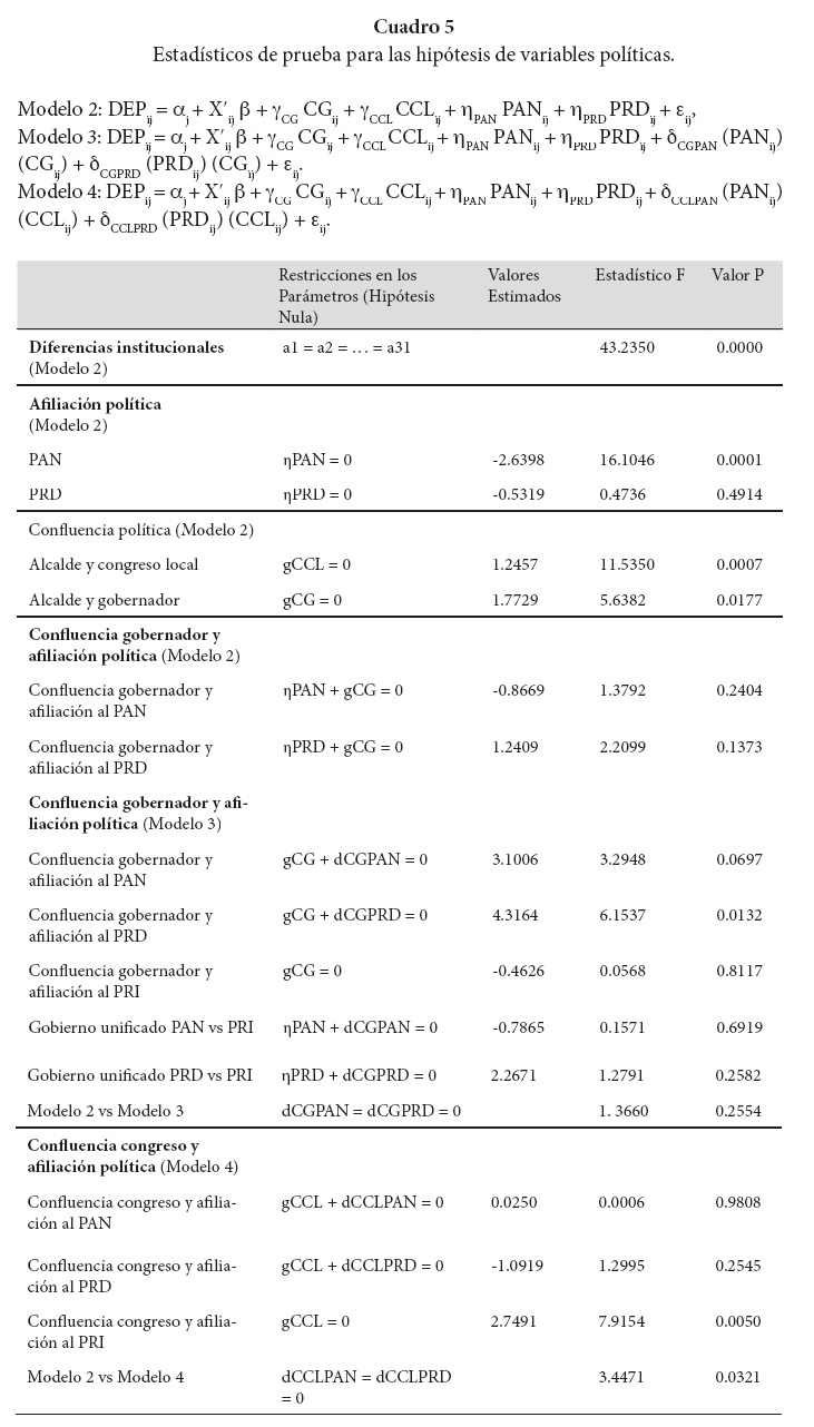 Los resultados de las estimaciones se presentan en el Cuadro 4 y los estadísticos de prueba para las hipótesis sobre la influencia de las diferentes variables políticas en la dependencia financiera municipal, se muestran en el Cuadro 5.