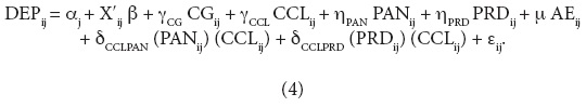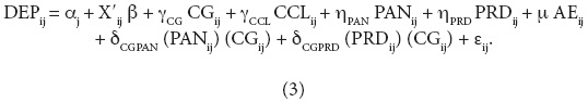 El Modelo 2, sin embargo, no incorpora la interacción entre variables políticas. En particular, en ese modelo se supone que el efecto de un gobierno unificado entre el gobernador y el alcalde es independiente de la afiliación política de este último. Esto es, la diferencia en dependencia financiera entre un gobierno unificado y uno dividido, sin importar la afiliación política del alcalde, es capturado por el parámetro γCG. Reconociendo que el efecto de la confluencia política sobre la dependencia financiera puede variar dependiendo de la afiliación política del presidente municipal, especificamos el Modelo 3: