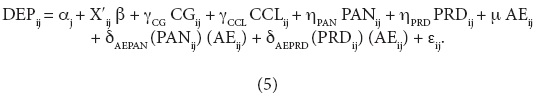 En este caso δAEPAN+ μ representaría el efecto sobre la dependencia financiera del ciclo electoral si el alcalde está afiliado al PAN; δAEPRD+ μ es el efecto correspondiente si la afiliación del alcalde es al PRD; y μ si al alcalde estuviera afiliado al PRI. De esa forma, y diferente al Modelo 2, en el Modelo 5 el impacto del ciclo electoral puede ser distinto en función de la afiliación política del presidente municipal. El parámetro δAEPAN(δAEPRD) representa el efecto diferencial del ciclo electoral de un alcalde afiliado al PAN (PRD) en comparación con la afiliación al PRI. La influencia de los ciclos electorales sería independiente de la afiliación política del presidente municipal si δAEPAN= δAEPRD= 0.