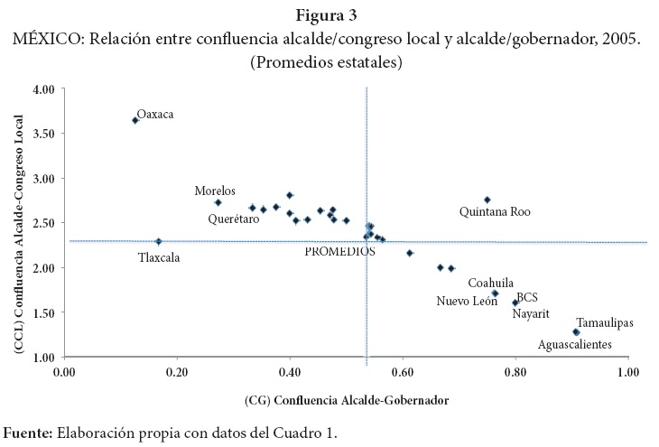 Las entidades federativas en que se registró el mayor grado de división política en 2005 a juzgar por el índice de confluencia entre el alcalde y el congreso local, fueron Oaxaca, Colima y Quintana Roo. Consistente con lo que se apuntó en un párrafo anterior, el índice de confluencia alcalde/congreso local promedio de Oaxaca fue 3.61, ya que el 74% de los municipios se rige por usos y costumbres, en tanto que el congreso local tuvo mayoría absoluta del PRI (60%). En Colima el índice de confluencia promedio fue 2.80: el congreso local tuvo mayoría absoluta del PRI (52%) y la mayoría de los municipios en ese estado (50%) fueron presididos por un alcalde afiliado al PAN, en tanto que el gobernador tenía afiliación al PRI. En Quintana Roo, estado también gobernado por el PRI, el índice de confluencia promedio fue 2.75, tuvo mayoría relativa del PRI en el congreso local (32%), y la gran mayoría de los alcaldes estuvieron afiliados al PRI (67%).