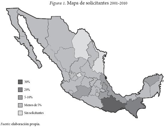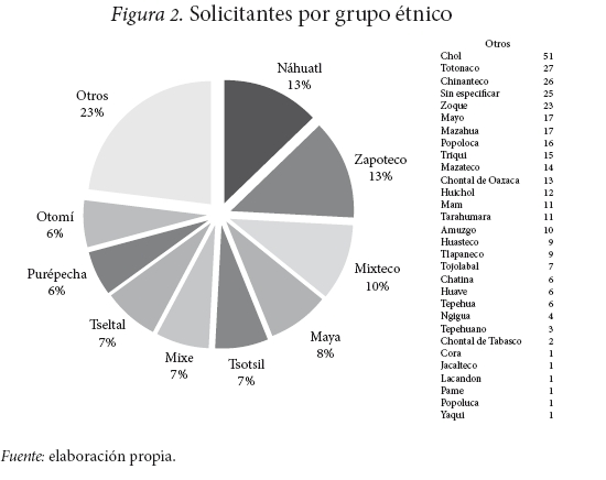 Como muestra el mapa, Oaxaca y Chiapas son los estados donde procedió el mayor número de candidatos, seguidos de Yúcatan, Veracruz, Puebla y Michoacán. En concordancia con el tamaño y distribución territorail de la población indígena a nivel nacional, los estados del occidente y norte reportarón la menor cantidad de solictantes.