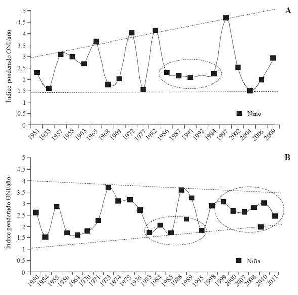 By applying this index to estimate the intensity of the events, it is possible to confirm that in the 80's and 90's there was a lower frequency of cold conditions in the tropical Pacific (Figure 1B) and a stabilization in the occurrence of warm phenomena (Figure 1A). However, since the late 1990's and the first decade of the 21st Century, colder conditions have prevailed in the Pacific and in the warm events that took place in this time have been weak.
