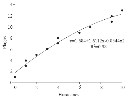 The proportion between exotic pests found historically and the number of hurricanes that hit Mexico was highly significant (r2=0.98). The occurrence of pests had a direct relation with time, presenting an exponential increase in the period between years 2000 and 2012 for insects (r2=0.96) and pathogens without an associated vector (r2=0.82). The occurrence of pathogens with a vector had no direct significant association (r2=0.55) (Figure 4A). The association between insect pests and the number of hurricanes was of r2 = 0.95, and between pathogens with and without vectors had an association of r2 = 0.84 y 0.82, respectively (Figure 4B).