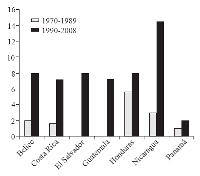 Similarly to Mexico, Central American countries observed an increase in the frequency of hurricanes and tropical storms. From 1990 to 2008, occurrence approximately tripled in comparison to the 1970 - 1989 period (Figure 3) (PROMECAFE, 2013).
