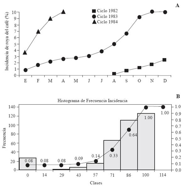 Figure 5 Incidence of Hemileia vastatrix. A. Cycles in 1982-1984 in Chiapas at 780 masl, B. Histogram of frequencies of rust incidence, which includes the curve of accumulated frequencies, obtained using national data from SICAFI from January 1 to March 8, 2013.