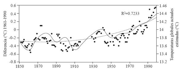 In order to analyze the increase of the intensity and occurrence of the pathogens and pests, it is necessary to consider that historically variations show fluctuation, mainly in temperature with regard to the annual average. In general, from 1850 to 2000, there was an increasing tendency (r2=0.72). Figure 6 shows that from 1850 to 1870 there was a temperature reduction of 0.2 °C; however, after this, there was an increase in the historical average. Between 1870 and 1910, this temperature repeated itself in the following 50 years with similar periods and durations. Starting in 1950, a period of temperatures slightly below the average was observed, and followed by a tendency to increase until the year 2000.