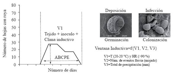 In coffee rust, these two processes require the combination of temperatures between 20 and 22 °C, the presence of liquid water, and a low light intensity (SENASICA, 2013); these conditions occur mainly between 1am and 9am. The combination of the climate variables described above, related to increases or decreases of rust estimated with the calculation of areas under the disease progress curve (AUDPC), was named "windows of climatic inductivity" (WCI) (Figure 7) (Mora-Aguilera et al., 2012). These WCI were studied in time intervals that related the amount of inoculum, amount of host leaves and the combinations of favorable climate conditions for the increase of the epidemic in the years 2009-2010.
