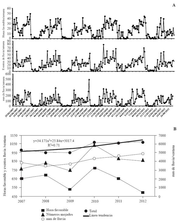 It is important to consider that the independent study of variables can produce partial results on the increase of rust, and the effects of climate do not present themselves in short periods of time (Figure 8A). However, when adding variables based on the combination of conditions that favor the infection period such as favorable hours (T: 20-22 °C, HR: >90 %) in addition to the number of rainfalls and mm of rainfall accumulated per week, the biological event can be understood better. In this way, we found that during the years 2007 to 2009, favorable conditions were constant in comparison to the average, and presented no significant increases. However, in the year 2009 favorable conditions increased. The combined accumulated values were adjusted to a quadratic model that suggests that the favorable conditions will continue to increase in a constant manner in upcoming years (r2=0.71) (Figure 8B).