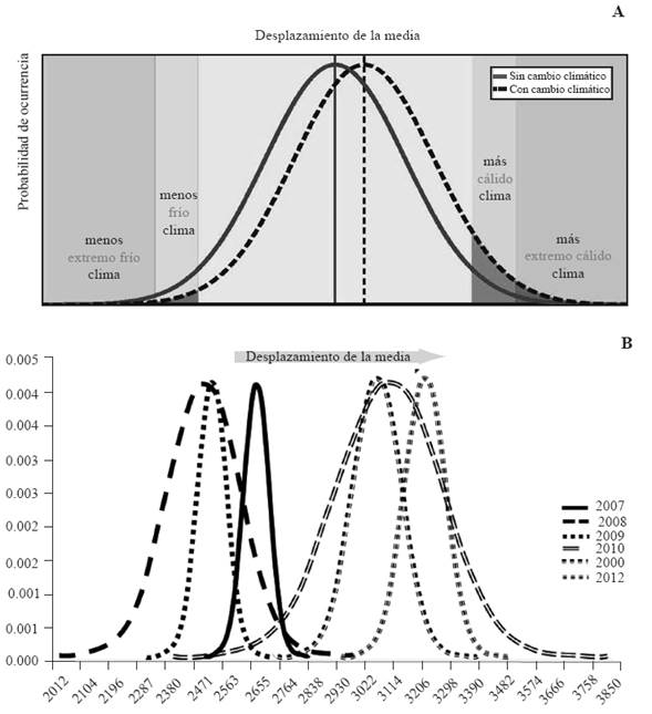 In addition, there is a natural variability that must be taken into account in climate studies in order to identify "extreme" climate changes, or changes in tendencies in time. The theoretical displacements of the average or normal climate displacements suggested by IPCC, 2013 (Figure 9A), stipulates that the average temperature undergoes a positive displacement effect, increasing the maximum temperatures. Other theoretical models include the increase of the variance, yet maintaining the regional normal.