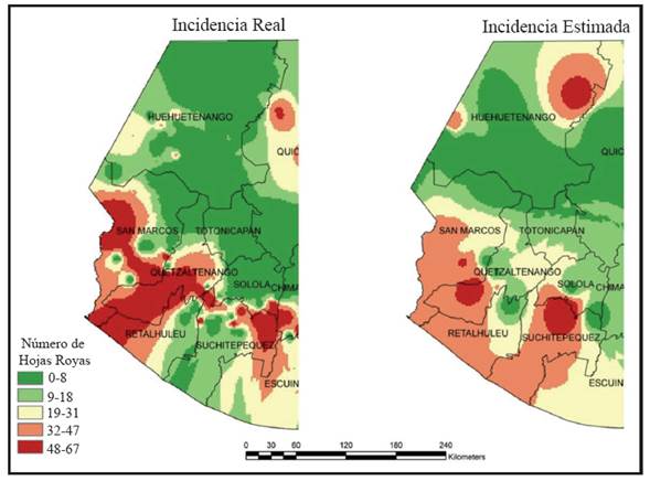 These theoretical models were analyzed in coffee rust by finding the annual WCI for 2007-2012. The average, and the variance, to a lesser extent, had a displacement effect for 2007-2012 which increased notoriously in the years 2009 to 2010, which was the last period of greatest productivity for the increase of coffee rust (Figure 9B). These calculations implied a 6-year period, although they required the use of 318,000 measurements of four climate variables from the National Coffee Association (ANACAFÉ) weather station network. These findings suggest negative effects of climate change in terms of a higher intensity and range of inductive windows, adequate for the induction of germination and penetration of fungal spores; a possible hypothesis could be that the occurrence of high to moderate epidemics in the future may be more frequent, and that current epidemic events regarding rust in Central America are not sporadic. Knowing the effect of climate on the increase of the occurrence and severity of rust helps understand the epidemic behavior for the conditions in Guatemala and other regions. With this it is possible to estimate forecast models based on epidemic inductivity levels. Figure 10 shows comparative maps of the damage intensity interpolations in the coffee-growing area of the Southwestern coast of Guatemala. The map on the left shows the real incidence in leaves with rust, and in comparison, map on the right shows the estimated incidence through the model of windows of climatic inductivity mentioned earlier. These results are currently under validation with data from epidemics from 2013 obtained through national monitoring programs in Mexico and Guatemala with rust management purposes.