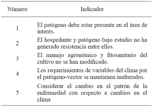 In general terms, the early alert systems aimed at implementing control methods estimate the increase of the organism in specific events, particularly those related to pathogenesis. The windows of climatic inductivity take these events into account for timely decision-making. However, it is necessary to consider that each system has its own climate requirements. Table 4 shows the temperature ranges for different pathogens that infect tropical crops, such as coffee rust, which has generally short ranges. This suggests that climate changes could influence the processes of pathogenesis, possibly increasing its epidemic level, and therefore its epidemiological surveillance.