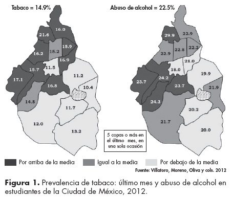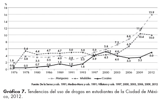** Chávez J, Villatoro J, Robles L, Bustos M et al. Encuesta escolar sobre adicciones en el Estado de Jalisco 2012.Consejo Estatal Contra las Adicciones de Jalisco. México, DF: Instituto Nacional de Psiquiatría Ramón de la Fuente Muñiz; 2013.