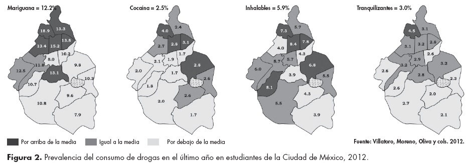 Las Delegaciones más afectadas por el uso de mariguana en el último año, fueron Azcapotzalco (18.9%), Cuauhtémoc (15.2%), Venustiano Carranza (13.8%), Miguel Hidalgo (13.4%), Gustavo A. Madero (13.3%) y Coyoacán (13.1%). En cuanto al consumo de cocaína en el último año, las Delegaciones más afectadas fueron Azcapotzalco (4.0%), Venustiano Carranza (3.1%), Cuauhtémoc e Iztapalapa (2.8% ambas). Para el consumo de inhalables en el último año, las Delegaciones con mayor porcentaje fueron Cuauhtémoc (8.4%), Magdalena Contreras (8.1%), Venustiano Carranza (7.8%), Azcapotzalco (7.3%) e Iztapalapa (6.8%). Finalmente, en cuanto al consumo de tranquilizantes en el último año, la Delegación con una prevalencia por arriba de la media de la Ciudad de México, es Azcapotzalco (4.5%) (figura 2).