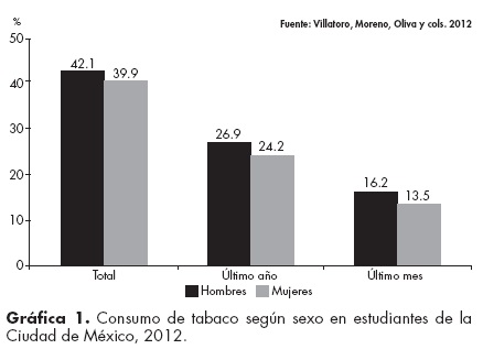 Asimismo, 21.7% de la población total de entre 12 y 65 años son fumadores activos. Los hombres fumadores activos de la ENA del 2011 (31.4%) disminuyeron con respecto a la del 2002 (36.2%). En la población adolescente de 12 a 17 años, la prevalencia de fumadores activos en 2011 fue de 12.3%. En las mujeres la prevalencia aumentó de 3.8% en 2002 a 8.1% en 2011. La edad de inicio de consumo de tabaco fue de 14.1 años, similar para ambos sexos.4
