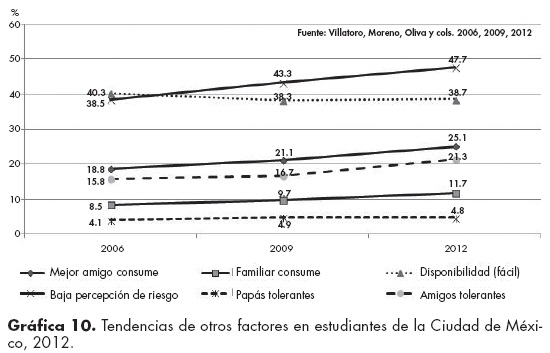 En cuanto a la tendencia de la percepción de riesgo, a partir de 2006 observamos que más estudiantes perciben un bajo riesgo hacia el consumo de drogas (38.5% a 47.7% en 2012). Así también, un mayor porcentaje de amigos del adolescente se muestra tolerante hacia el consumo de drogas, mientras que en los padres la tolerancia hacia las drogas mantiene porcentajes similares (gráfica 10).