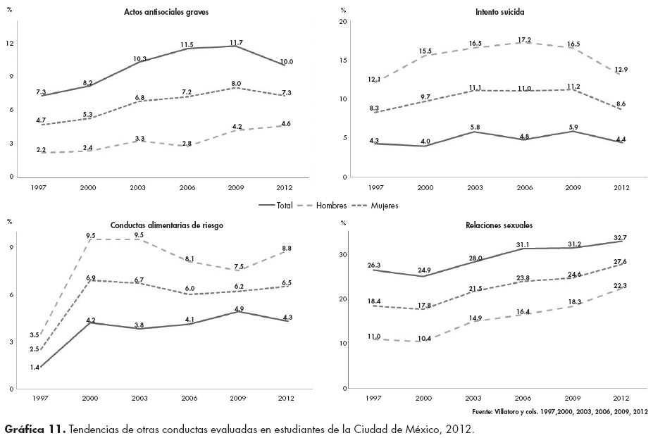 En relación al intento suicida, esta conducta disminuyó de manera importante en los estudiantes. En los hombres disminuyó de 5.9% en 2009 a 4.4% en 2012. Para las mujeres esos porcentajes van de 16.5% en 2009 a 12.9% en 2012.