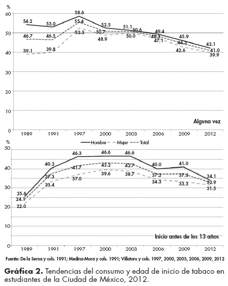 La medición del 2009, que se realizó en la Ciudad de México,6 mostró que el consumo de cualquier droga alguna vez aumentó de 17.8% a 21.5%. En cuanto al consumo de alcohol alguna vez, la prevalencia aumentó de 68.8% a 71.4%, con porcentajes similares para ambos sexos. En cuanto al tabaco, el consumo alguna vez disminuyó de 48.3% a 44.3% en 2009; en hombres disminuyó de 49.4% a 45.9% y en mujeres de 47.1% a 42.6%. Sin embargo, la proporción de estudiantes que iniciaron el consumo antes de los 13 años de edad fue similar entre 2006 y 2009, con 37.2% y 37.3%, respectivamente.