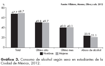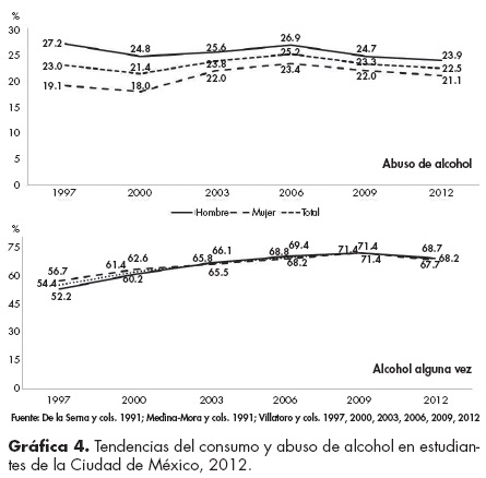 En cuanto al alcohol, su consumo presentó disminuciones entre 2009 y 2012 (de 71.4% a 68.2%), con una prevalencia similar entre hombres y mujeres. Asimismo, la prevalencia de abuso de alcohol se mantuvo estable y la edad de inicio promedio de esta sustancia se mantuvo en los 12.6 años.