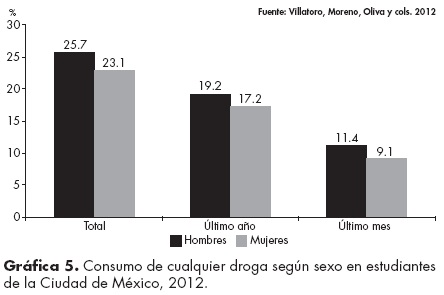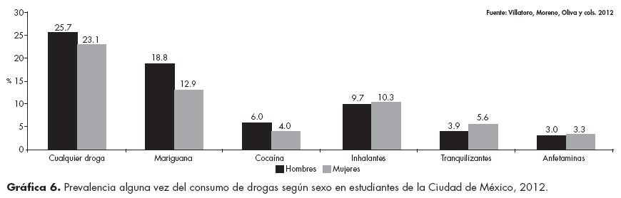 Para las drogas médicas (tranquilizantes, anfetaminas y sedantes), así como para los inhalables, el consumo es mayor en las mujeres; en tanto que el consumo de drogas ilegales (mariguana, cocaína, crack, alucinógenos, metanfetaminas y heroína) es mayor en los hombres (gráfica 6).