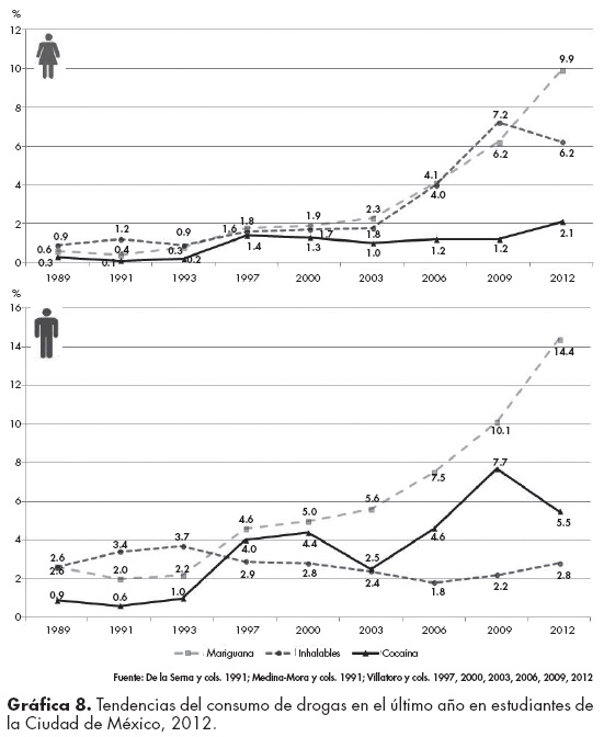 Las drogas que mostraron aumentos en su prevalencia fueron la mariguana, la cocaína y el crack, tanto en hombres como en mujeres. Adicionalmente, en los hombres el consumo de inhalables disminuyó significativamente y en las mujeres se mantuvo. Este es un dato relevante ya que se esperaba que el consumo de inhalables se incrementara y su prevalencia fuera mayor a la de la mariguana.