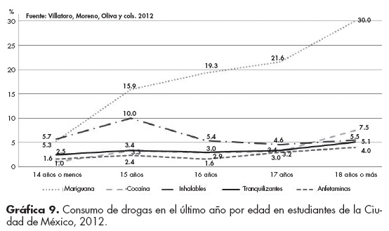 Con relación a la edad y el consumo de drogas en el último año (gráfica 9), se observa que los inhalables y la mariguana son las principales sustancias consumidas a los 14 años o antes, en tanto que el porcentaje de usuarios de mariguana se triplica entre los 14 y los 15 años. El consumo de las demás sustancias se mantiene similar en estos rangos de edad con ligeros incrementos para el consumo de cocaína.