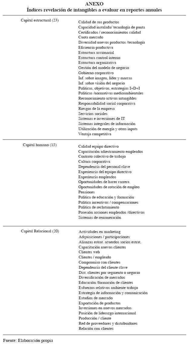 Una vez que se seleccionaron las empresas, se buscaron los informes anuales, los cuales están estructurados de acuerdo con la información general, la historia de la compañía, la información financiera, administración y anexos. Con esto se determinaron la variable dependiente y la variable dicotómica, considerando el valor de 1 si las empresas divulgan capital intelectual y el valor 0, en caso contrario. Esto se realizó mediante la lectura y análisis de los reportes anuales correspondientes a 2005, determinando cada uno de los índices correspondientes al capital estructural, capital humano y capital relacional, con un total de 58 ítems (véase Anexo 1). La clasificación de los activos intangibles en las tres categorías anteriores se ha realizado siguiendo la literatura empírica previa (Edvinsson y Malone, 1997; Euroforum, 1998 y Cañibano et al., 2002).