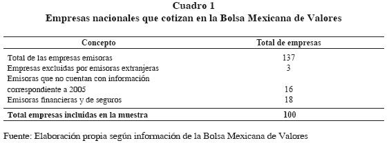 En el cuadro 1 se presentan 137 empresas que cotizaron en 2005, de las cuales se excluyó un 0.02% de empresas de capital extranjero que cotizan en México; de igual forma, se prescindieron de aquellas empresas que en ese mismo año no contaban con información financiera, las cuales representan 12%; asimismo, se descartó 13% correspondiente a empresas que poseían capital ajeno, como son las instituciones financieras y de seguros. Después de aplicar los filtros anteriores, se obtuvo un total de cien empresas por analizar que representan 73% de las empresas emisoras.