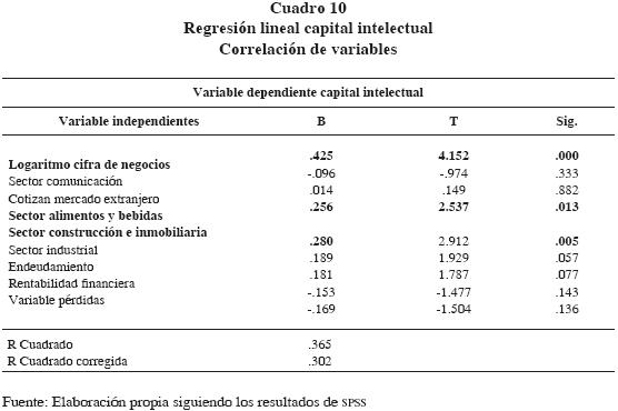 Con base en el resultado anterior, y para conocer estadísticamente el factor que más influye en las empresas para que éstas divulguen información, se llevó a cabo el análisis multivariado, utilizando el método estadístico de regresión lineal, el cual estima los coeficientes de la ecuación lineal de cada variable independiente que mejor prediga el valor de la variable dependiente; con este análisis comprobaremos si las variables independientes son capaces de pronosticar o explicar la divulgación del capital intelectual. El cuadro 10 muestra la prueba estadística de regresión lineal. Se incluyó sólo una proxy de tamaño, verificándose la ausencia de multicolinealidad.