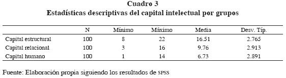 Este análisis estadístico de la información divulgada referente al capital intelectual, que se refleja en el cuadro, indica que el capital estructural posee el mayor porcentaje de divulgación (16.51), seguido por el capital relacional (9.76) y finalmente el capital humano (6.73). Con respecto a estos resultados, a continuación se reflejan los datos estadísticos descriptivos de cada uno de ellos para así determinar los ítems que conforman la clasificación del capital intelectual.