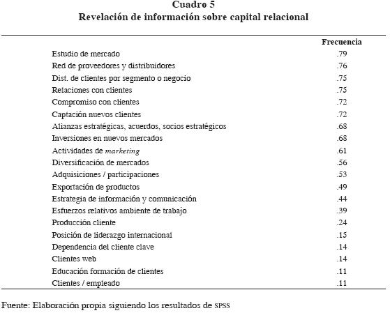 El cuadro 5 detalla los resultados del capital relacional, aspecto que contempla las relaciones de la empresa con clientes, competidores, accionistas, así como otros agentes. El capital relacional ocupa el segundo lugar en la divulgación de los activos intangibles para las empresas mexicanas. Los aspectos más destacados por divulgar se encuentran entre un 70% y 80%, los cuales corresponden a los siguientes ítems: estudio de mercado, red de proveedores y distribuidores, distribución de clientes por segmento o negocio, relaciones con clientes, compromiso con clientes y captación de nuevos clientes. Los ítems menos valorados se encuentran entre un 10% y 15%, que corresponden a posición de liderazgo internacional, dependencia del cliente clave, clientes web, educación, formación de clientes y cliente empleado.