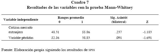 Una vez determinada la prueba estadística, consideraremos la prueba de MannWhitney, la cual se aplicó a las variables dicotómicas que corresponden a la cotización en el mercado extranjero y a las pérdidas.