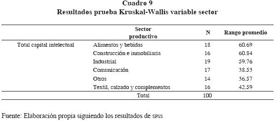 Por otra parte, la variable sector se analiza de manera separada porque con esta prueba se define si la divulgación de capital intelectual presenta niveles de similitud en los seis sectores productivos de las empresas. En el cuadro 9 se muestran los resultados.