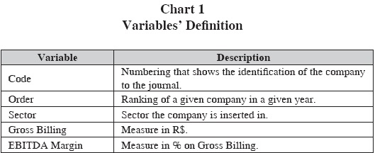 The research data were collected from the database of Revista Exame Melhores e Maiores, for the period from 2003 to 2007. Melhores e Maiores magazine compiled an annual database of Brazilian companies and then, selected the 500 largest and best companies. Financial institutions were not part of the database. Data refer to absolute amounts, in reais (R$), for the EBITDA and gross revenues for the companies the magazine listed. Some firms are repeated year after year, characterizing repeated measures. The criterion for inclusion in the research database was that a company had to be present on the magazine's list in at least two out of five years in the sample. The sequence of years for a company's appearance did not matter. Companies should have presented their gross sales and EBITDA in reais. The database was composed based on the following variables, presented in Chart 1.