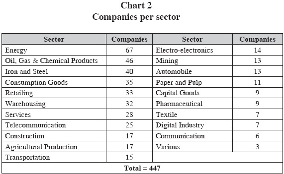 Applying the selection criteria to the database to exclude companies, the end sample results in 447 companies that remain, distributed in their respective sectors according to Chart 2.
