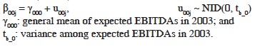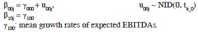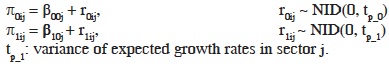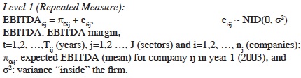 To verify the first two research questions, a model without predictive variables is proposed (the null model), which offers estimations of variance components in each firm (over time), among firms and among sectors.